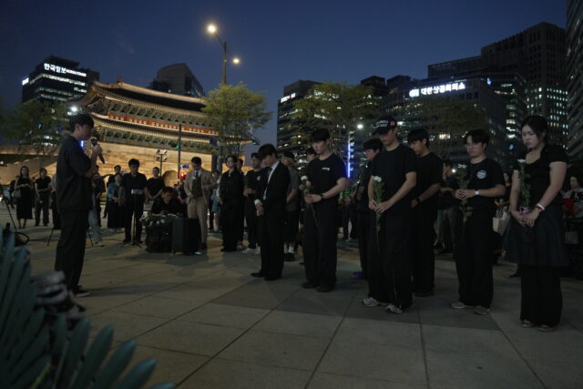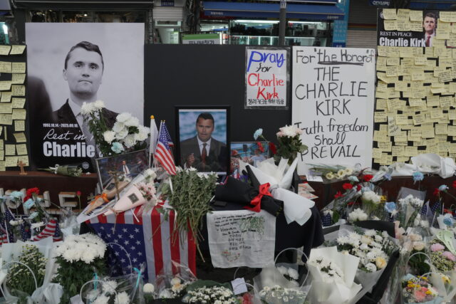 Nonostante il piazzale sia immenso e con una grande rotatoria nel mezzo, è impossibile non notare la grande foto di Charlie Kirk, che campeggia in un angolo, accerchiata da corone di fiori funebri e pannelli su cui attaccare dei post-it. Molti passanti si fermano, qualche curioso chiede di che cosa si tratti e poi c’è chi è già munito di fiori e va a porgere l’ultimo saluto al “martire della libertà” e gli dedica un minuto di silenzio. Anche i turisti non rimangono indifferenti: una coppia di occidentali si avvicina al memoriale, l’uomo va spedito verso la foto e fa cenno di una carezza sul volto di Kirk. Mi dicono di venire dalla Francia, probabilmente – penso io – sono elettori del Rassemblement National. Inizio a scattare qualche foto e a parlare con due membri della Free University che sono lì di presidio: “Charlie Kirk è diventato una figura molto nota dopo la sua visita qui in Corea del Sud” mi spiega uno dei due militanti, Kim Young-hyun, “Kirk si batteva per la libertà e ci ha lasciato dicendo di lottare per essa. L’alleanza tra Stati Uniti e Corea del Sud è forte e non si spezzerà”.