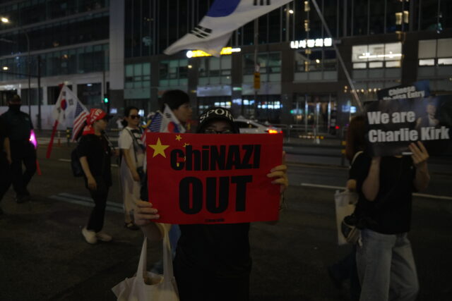 Le posizioni anti-cinesi diventano ancora più evidenti quando, il giorno successivo al memoriale, vado alla manifestazione che la Free University ha indetto a Myeongdong, quartiere della capitale noto soprattutto per lo shopping ma che per i militanti di estrema destra ha un significato completamente diverso, dal momento che proprio qui ha sede l’ambasciata cinese in Corea del Sud. L’appuntamento viene dato davanti al grande edificio delle poste e il mandato è quello di vestirsi di nero per onorare nuovamente la scomparsa di Kirk. Sempre in segno di lutto, il corteo sarà “silenzioso” e quindi senza tamburi a scandire i tempi dei cori.