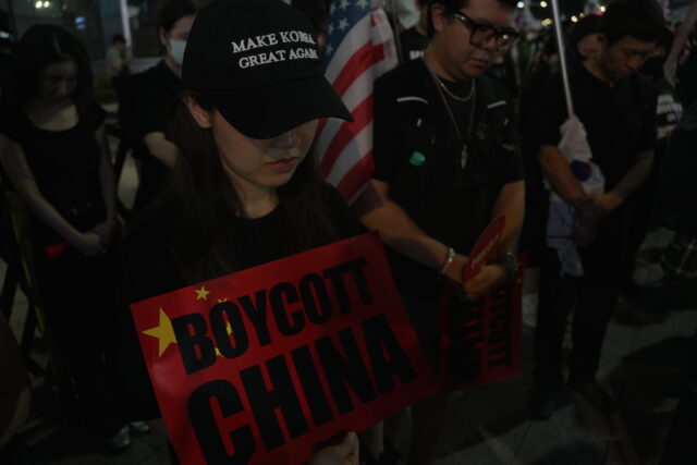Intanto, in mezzo al raduno di persone sempre più consistente, svetta uno stendardo dell’attuale presidente Lee Jae-myung a testa in giù e una gigantografia di Charlie Kirk. Tra i cartelli tenuti in mano dai manifestanti, oltre a “We are Charlie Kirk” in bianco su sfondo nero, ce n’è anche uno in rosso con su scritto “chiNAZI OUT” oppure “BOYCOTT CHINA”. Di sfondo, sul margine, le stelle gialle tipiche della bandiera cinese. Da alcune settimane, il corteo non riceve più l’autorizzazione necessaria a passare vicino all’ambasciata cinese. A inizio agosto, inoltre, la polizia ha aperto un’indagine nei confronti di un membro della Free University che avrebbe strappato uno striscione raffigurante il volto di Xi Jinping proprio davanti l’edificio. Nei suoi quasi tre anni di mandato, ma soprattutto con il colpo di mano poi fallito, Yoon ha polarizzato inesorabilmente la società coreana.